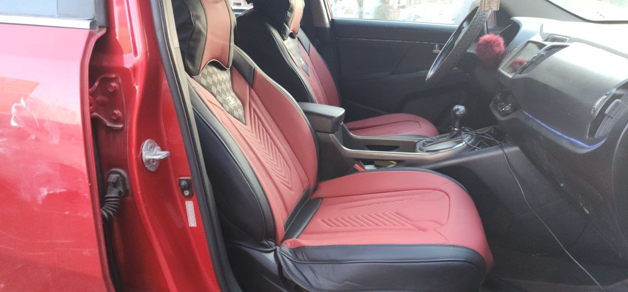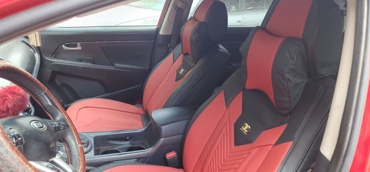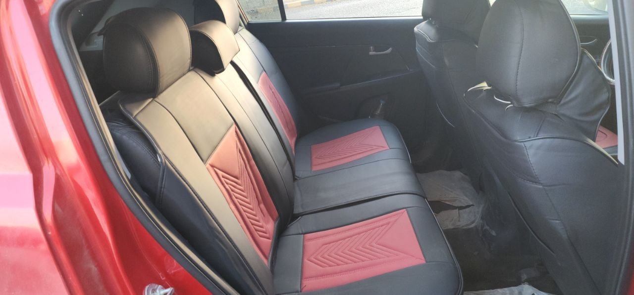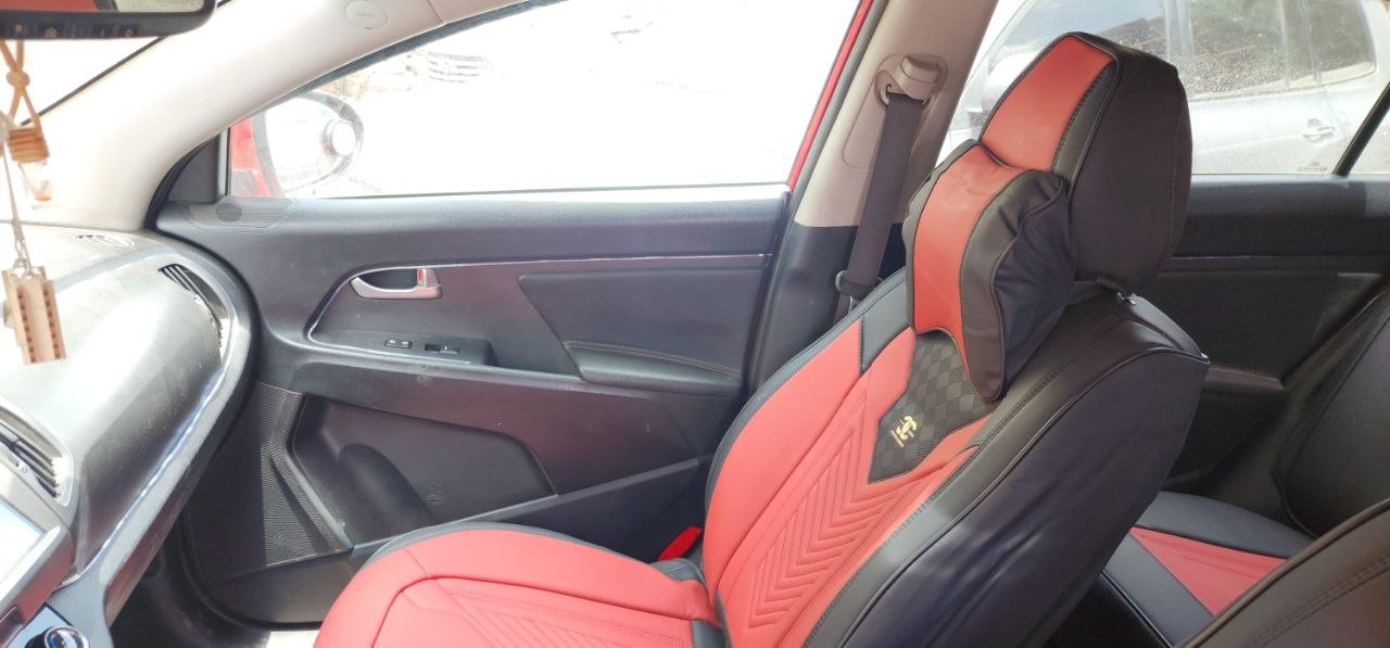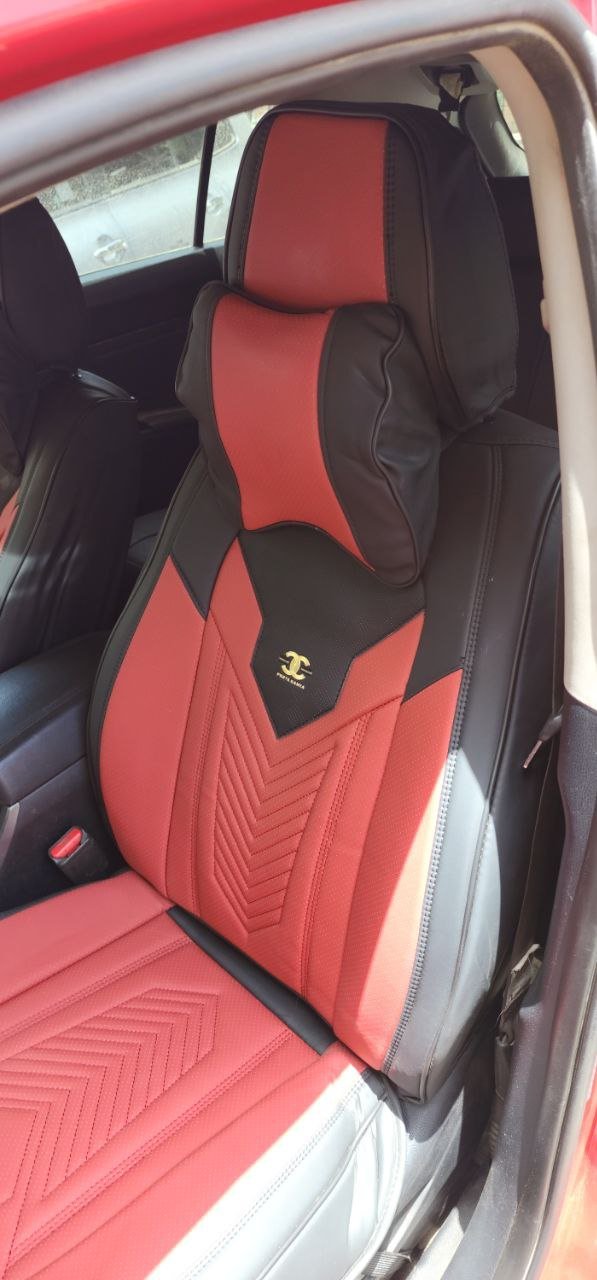 تلبيسة كراسي جلد راقي أحمرمع أسود. تتكون من 15 قطعة. مناسبة لجميع أنواع السيارات.