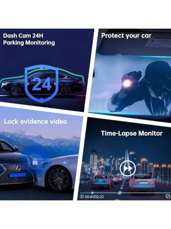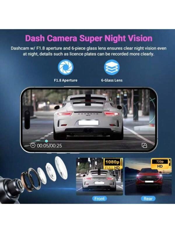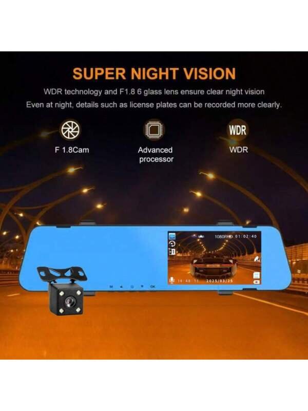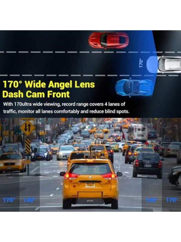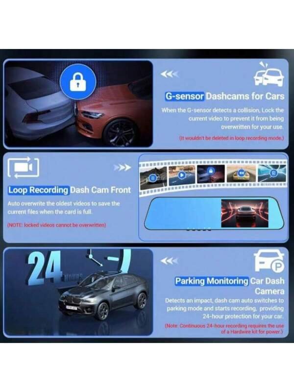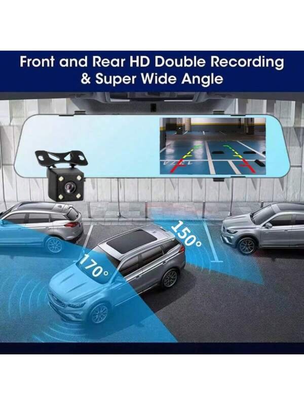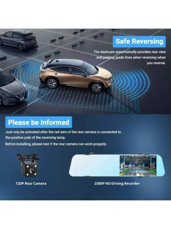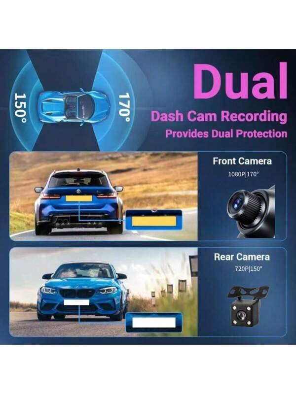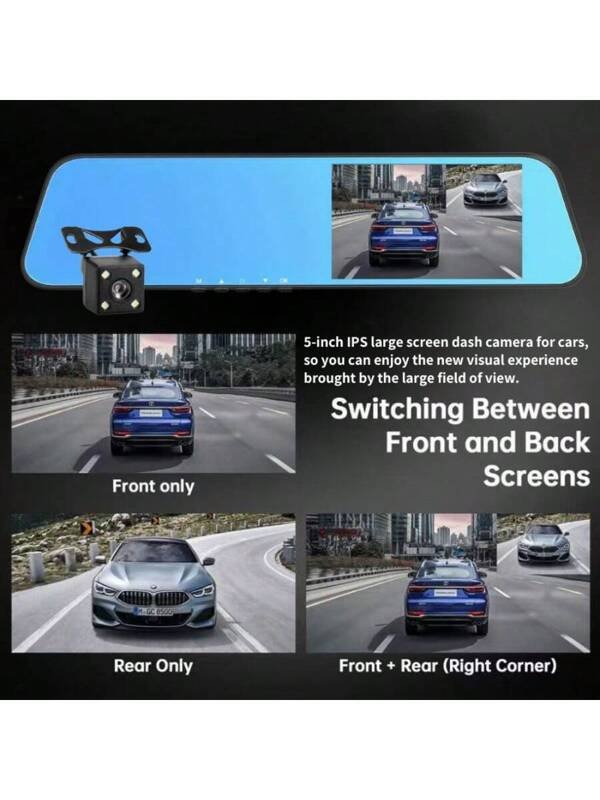 كاميرا مسجل السيارة ذات القناتين، 5.0بوصة، دقة عالية الوضوح ،FHD 1080Pزاوية واسعة للرؤية الخلفية، تسجيل لحظي، رؤية ليلية عالية الوضوح، استشعار الحركة، تسجيل متكرر.